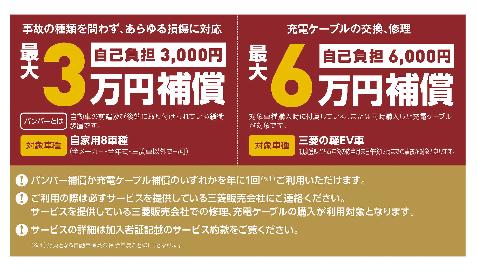 年に1回限り、バンパー補償/充電ケーブル補償のどちらかをご利用いただけます。